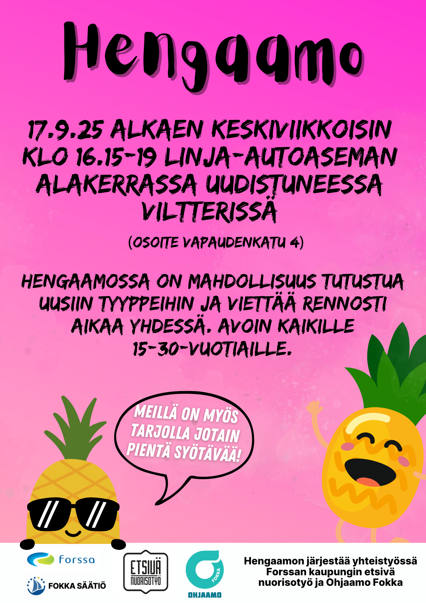 Forssassa ke klo 16-19 (hengailuryhmä 15-30 -vuotialle), seuraa ilmoittelua Ohjaamon somesta @ohjaamofokka.