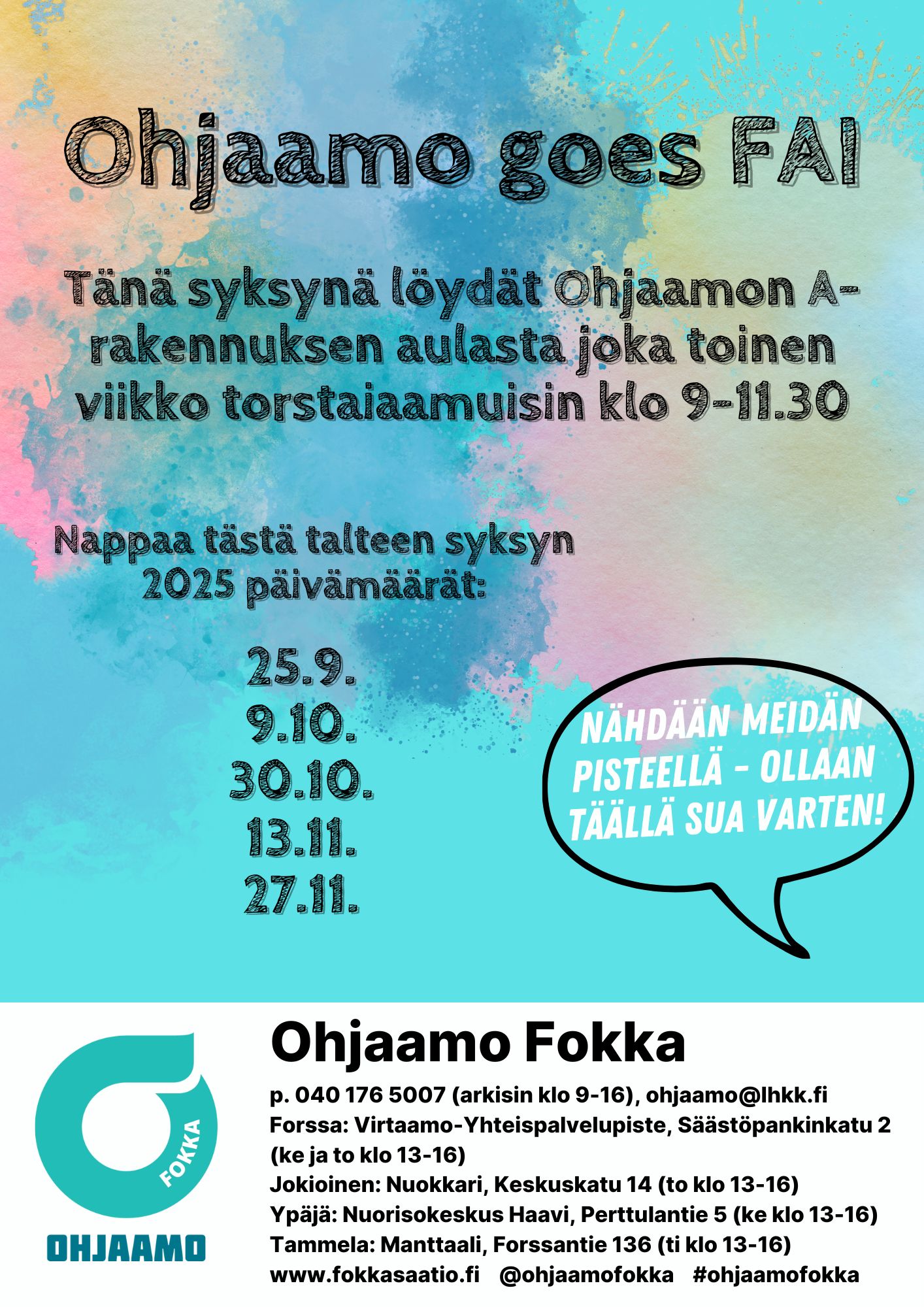 Ohjaamo jalkautuu Forssan ammatti-instituutille ja Forssan yhteislyseoon syksyn 2025 aikana torstaisin klo 9-11.30. Tarkemmat aikataulut molemmissa oppilaitoksissa löydät oheisista esitteistä.